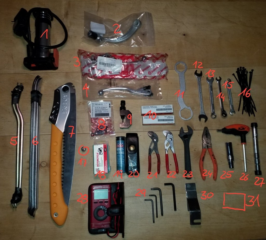 Here is a first Version of our Tool bag. We share the tools between the different bikes. The original OEM Toolkit resticts the scope of repairs to a minimum, so we decided to extend the tool kit as we share it between four bikes.