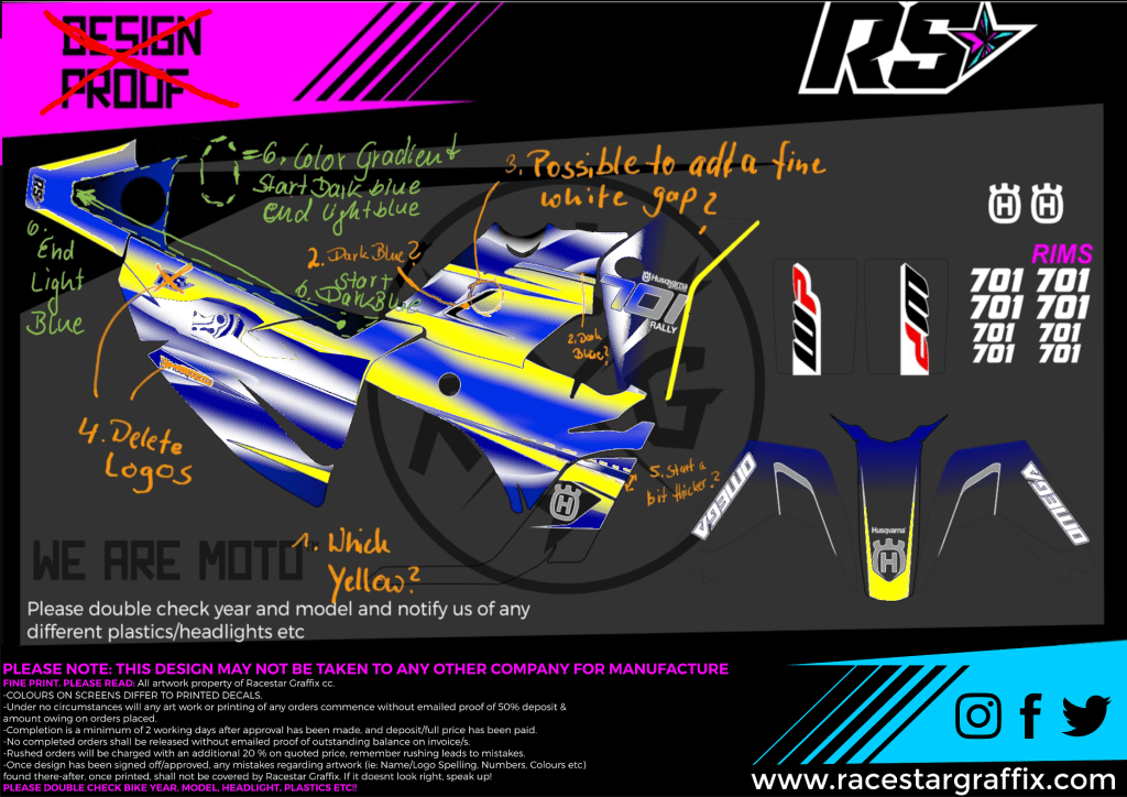 Together with the OMEGA 701 Rally Kit we ordered individual graphics for our motorcycles. Working on the design is ongoing in cooperation with Racestar Graffix SA.